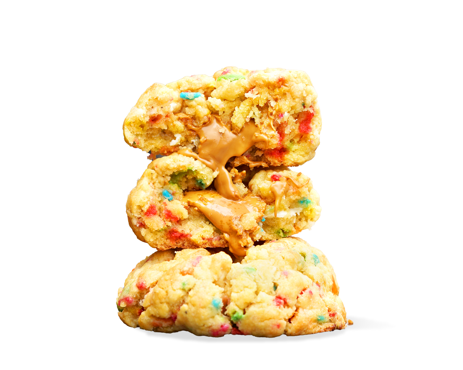 This cookie has toasted milky flavours and funfetti throughout the dough and is filled with our signature caramelised white chocolate center. Imagine a birthday cake that you wished for as a child, in a cookie form.