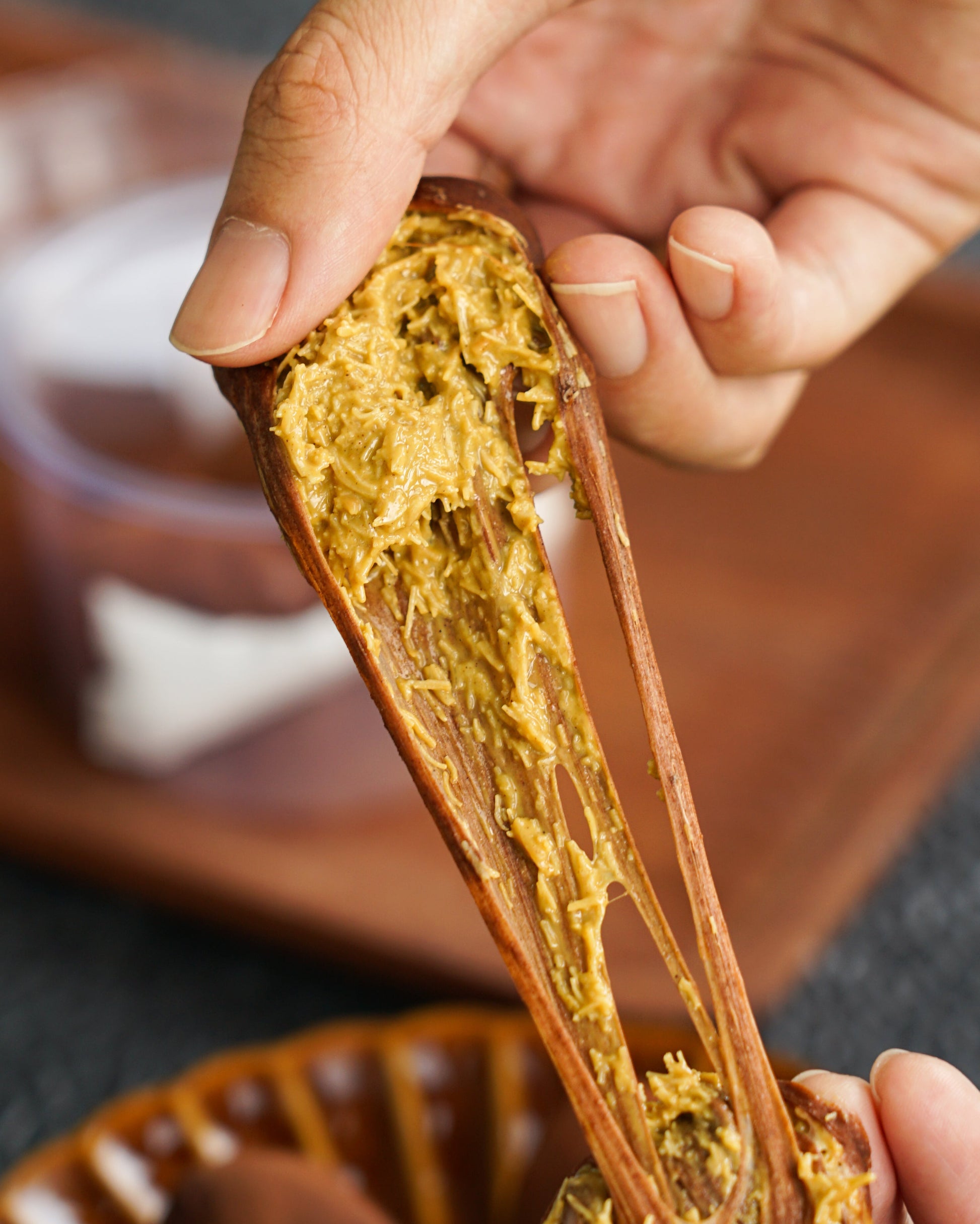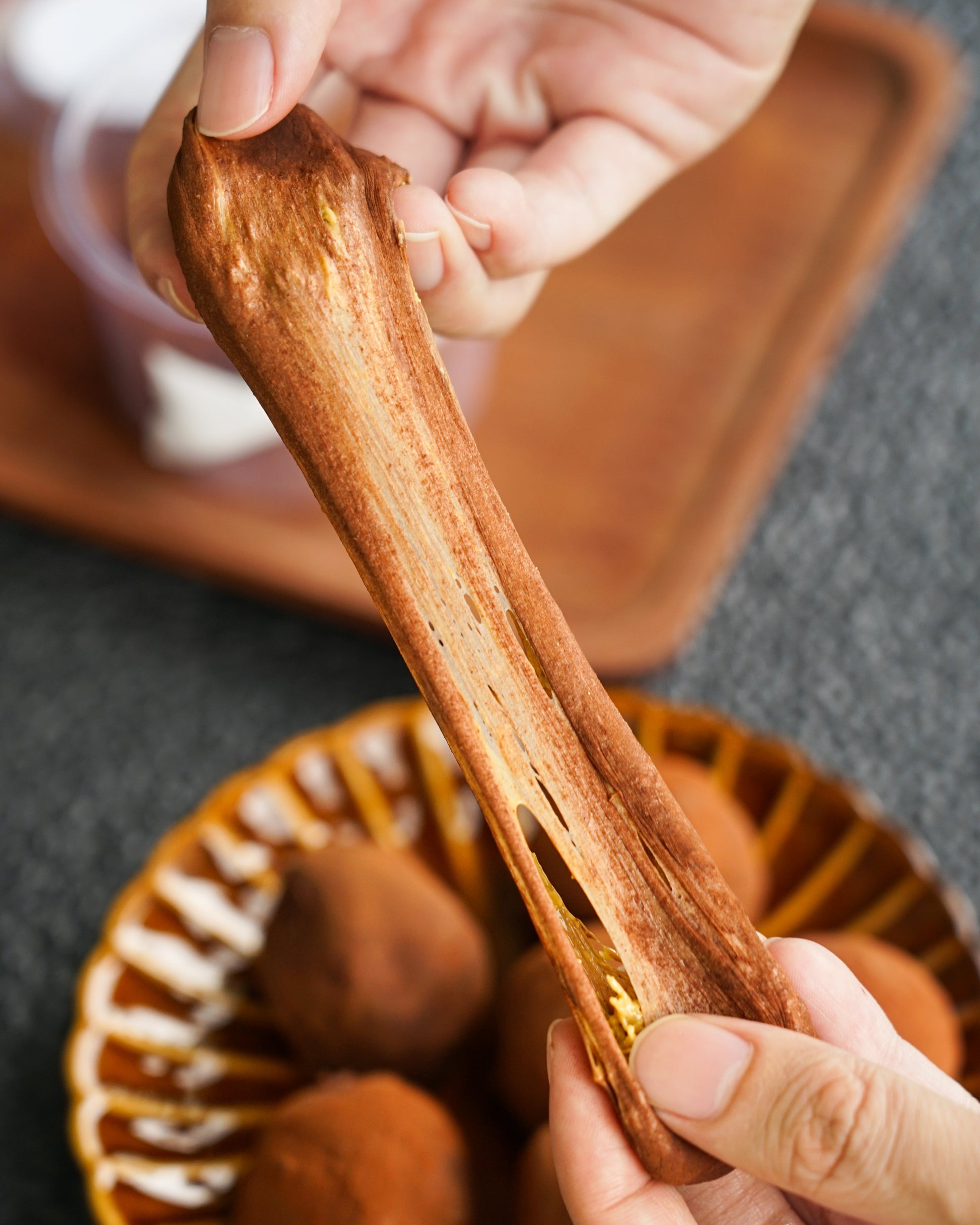 A soft, mochi like chocolate marshmallow skin wrapped around a rich Dubai kunafa filling. Using 100% roasted ground pistachios with a crunchy buttery kataifi filling balanced with a chocolatey chew. An indulgent treat inspired by the viral Korean dessert trend.