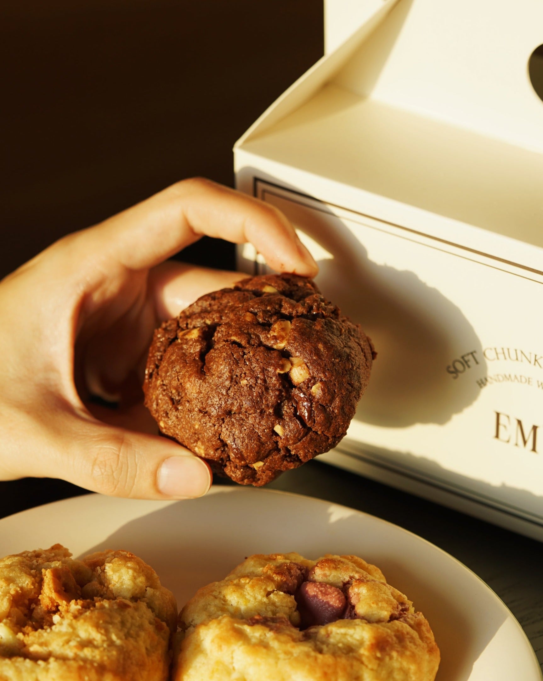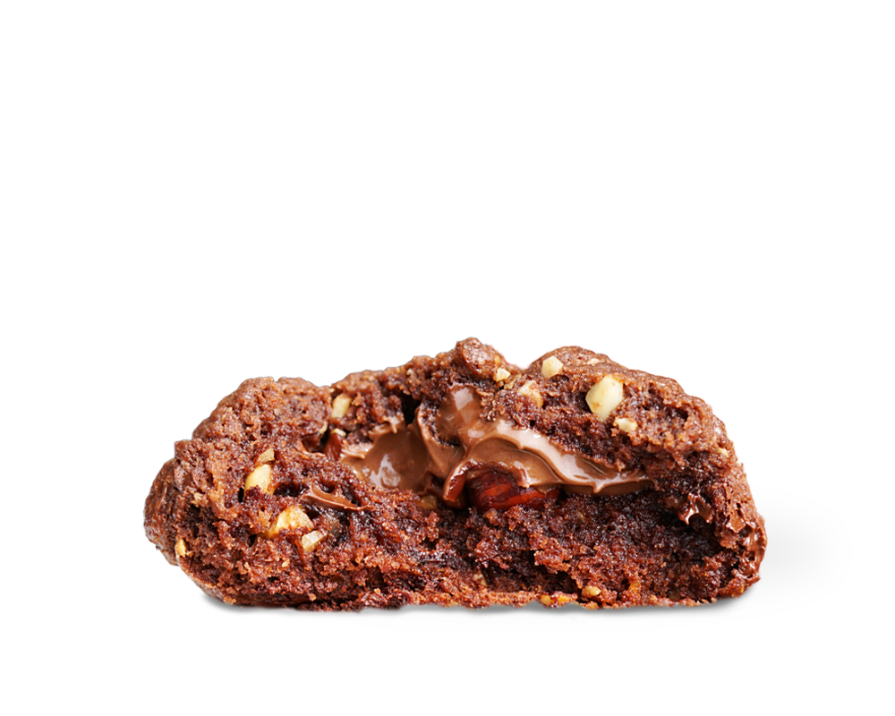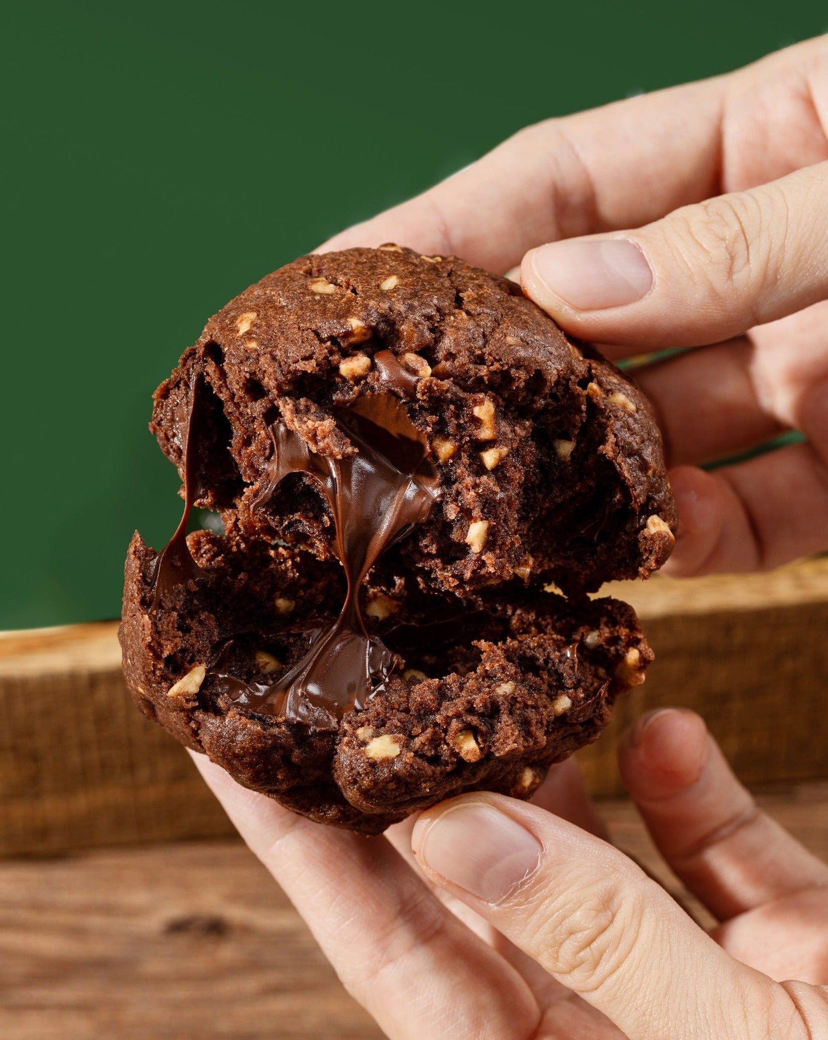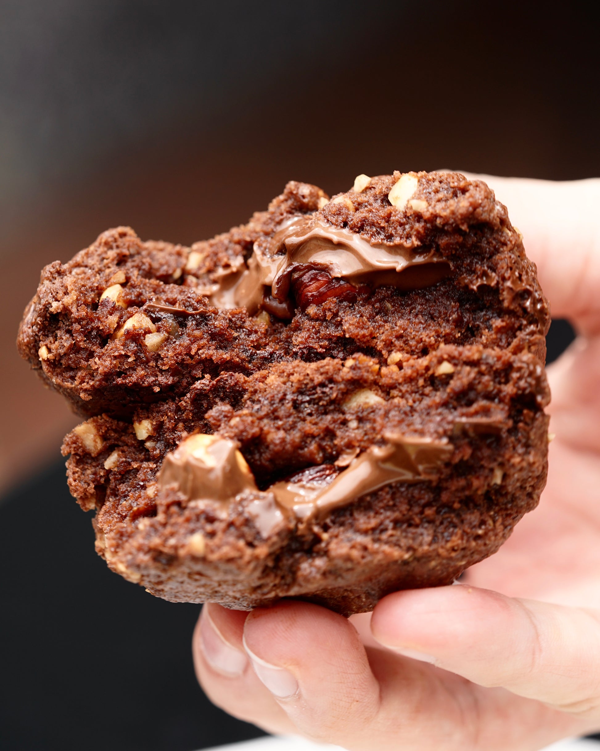 Made with a light chocolate dough with roasted hazelnut nibs throughout, 52-55% chocolate chips, whole roasted hazelnut pieces in the middle and a Nutella core. If you love Ferrero, you've gotta try this!